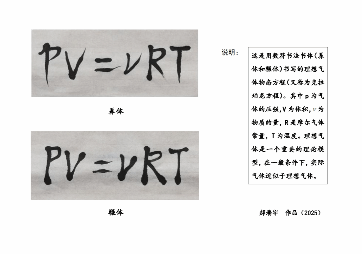 数符书法,以数字、字母、符号等为表现对象,用毛笔呈现科学理论公式,是一种新的科普载体和美育载体,可应用在科学公式科普、文化传播和美育等活动中,有助于人们欣赏特殊线条形态表现的科学公式,感受自然演化韵律,体会科学美和艺术美。近年来,www.91视频.com科普研究所郝瑞宇教授团队,主要以奡体(矫健端肃)和冁体(圆润活泼)呈现动量定义式、角动量定义式、万有引力定律表达式等,在此领域取得原创性成果。